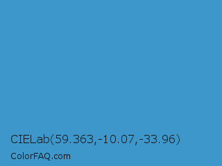 CIELab 59.363,-10.07,-33.96 Color is a normal blue color and the nearest color is Celestial Blue #4997d0. Hex code #3e97ca and RGB value is rgb(62,151,202). In RGB color space, this color is composed of 24% red, 59% green, 79% blue, In CMYK color space, this color is composed of 69% cyan, 25% magenta, 0% yellow , 21% black , In HSL color space, this color has a hue angle of 202° , 57% saturation and 52% lightness.