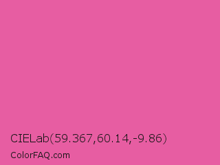 CIELab 59.367,60.14,-9.86 Color is a light rose color and the nearest color is Raspberry Pink #e25098. Hex code #e75da2 and RGB value is rgb(231,93,162). In RGB color space, this color is composed of 91% red, 36% green, 64% blue, In CMYK color space, this color is composed of 0% cyan, 60% magenta, 30% yellow , 9% black , In HSL color space, this color has a hue angle of 330° , 74% saturation and 64% lightness.