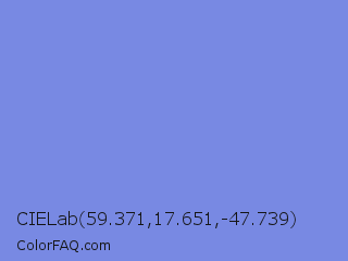 CIELab 59.371,17.651,-47.739 Color is a light blue color and the nearest color is Chetwode Blue #8581d9. Hex code #7889e3 and RGB value is rgb(120,137,227). In RGB color space, this color is composed of 47% red, 54% green, 89% blue, In CMYK color space, this color is composed of 47% cyan, 40% magenta, 0% yellow , 11% black , In HSL color space, this color has a hue angle of 230° , 66% saturation and 68% lightness.