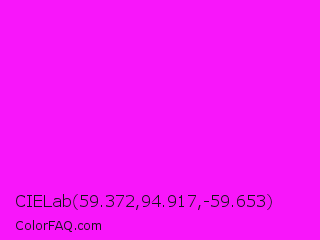 CIELab 59.372,94.917,-59.653 Color is a normal magenta color and the nearest color is Magenta / Fuchsia #ff00ff. Hex code #f816fa and RGB value is rgb(248,22,250). In RGB color space, this color is composed of 97% red, 9% green, 98% blue, In CMYK color space, this color is composed of 1% cyan, 91% magenta, 0% yellow , 2% black , In HSL color space, this color has a hue angle of 299° , 96% saturation and 53% lightness.