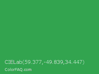 CIELab 59.377,-49.839,34.447 Color is a normal green color and the nearest color is Chateau Green #40a860. Hex code #32a34f and RGB value is rgb(50,163,79). In RGB color space, this color is composed of 20% red, 64% green, 31% blue, In CMYK color space, this color is composed of 69% cyan, 0% magenta, 52% yellow , 36% black , In HSL color space, this color has a hue angle of 135° , 53% saturation and 42% lightness.