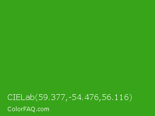 CIELab 59.377,-54.476,56.116 Color is a normal green color and the nearest color is Slimy Green #299617. Hex code #37a41a and RGB value is rgb(55,164,26). In RGB color space, this color is composed of 22% red, 64% green, 10% blue, In CMYK color space, this color is composed of 66% cyan, 0% magenta, 84% yellow , 36% black , In HSL color space, this color has a hue angle of 107° , 73% saturation and 37% lightness.