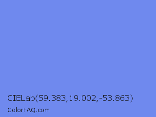 CIELab 59.383,19.002,-53.863 Color is a light blue color and the nearest color is Cornflower Blue #6495ed. Hex code #6f89ee and RGB value is rgb(111,137,238). In RGB color space, this color is composed of 44% red, 54% green, 93% blue, In CMYK color space, this color is composed of 53% cyan, 42% magenta, 0% yellow , 7% black , In HSL color space, this color has a hue angle of 228° , 79% saturation and 68% lightness.