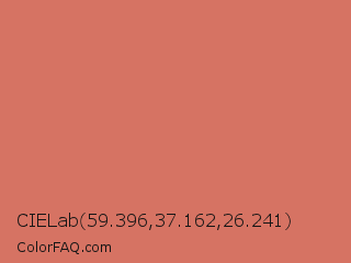 CIELab 59.396,37.162,26.241 Color is a light red color and the nearest color is Japonica #d87c63. Hex code #d67363 and RGB value is rgb(214,115,99). In RGB color space, this color is composed of 84% red, 45% green, 39% blue, In CMYK color space, this color is composed of 0% cyan, 46% magenta, 54% yellow , 16% black , In HSL color space, this color has a hue angle of 8° , 58% saturation and 61% lightness.
