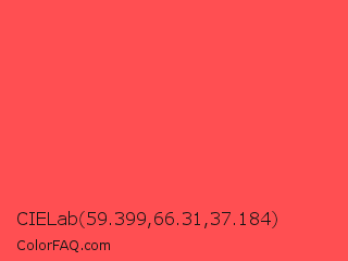 CIELab 59.399,66.31,37.184 Color is a light red color and the nearest color is Red Orange #ff5349. Hex code #ff4f52 and RGB value is rgb(255,79,82). In RGB color space, this color is composed of 100% red, 31% green, 32% blue, In CMYK color space, this color is composed of 0% cyan, 69% magenta, 68% yellow , 0% black , In HSL color space, this color has a hue angle of 359° , 100% saturation and 65% lightness.