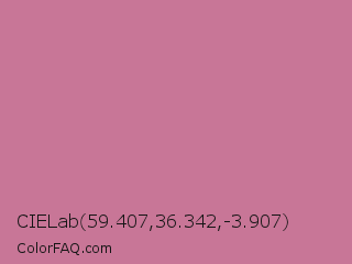 CIELab 59.407,36.342,-3.907 Color is a light rose color and the nearest color is Charm #d47494. Hex code #c87697 and RGB value is rgb(200,118,151). In RGB color space, this color is composed of 78% red, 46% green, 59% blue, In CMYK color space, this color is composed of 0% cyan, 41% magenta, 25% yellow , 22% black , In HSL color space, this color has a hue angle of 336° , 43% saturation and 62% lightness.