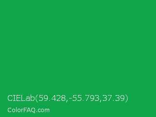 CIELab 59.428,-55.793,37.39 Color is a normal green color and the nearest color is Green Pigment #00a550. Hex code #0fa549 and RGB value is rgb(15,165,73). In RGB color space, this color is composed of 6% red, 65% green, 29% blue, In CMYK color space, this color is composed of 91% cyan, 0% magenta, 56% yellow , 35% black , In HSL color space, this color has a hue angle of 143° , 83% saturation and 35% lightness.