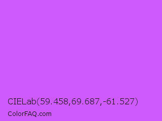 CIELab 59.458,69.687,-61.527 Color is a light purple color and the nearest color is Heliotrope #df73ff. Hex code #ce5afd and RGB value is rgb(206,90,253). In RGB color space, this color is composed of 81% red, 35% green, 99% blue, In CMYK color space, this color is composed of 19% cyan, 64% magenta, 0% yellow , 1% black , In HSL color space, this color has a hue angle of 283° , 98% saturation and 67% lightness.