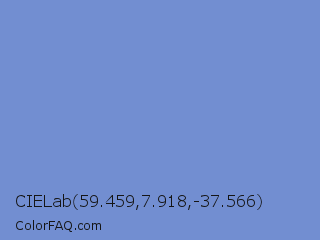 CIELab 59.459,7.918,-37.566 Color is a light blue color and the nearest color is Blue Gray #6699cc. Hex code #728ed1 and RGB value is rgb(114,142,209). In RGB color space, this color is composed of 45% red, 56% green, 82% blue, In CMYK color space, this color is composed of 45% cyan, 32% magenta, 0% yellow , 18% black , In HSL color space, this color has a hue angle of 222° , 51% saturation and 63% lightness.