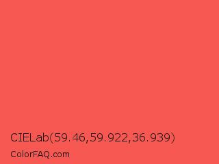 CIELab 59.46,59.922,36.939 Color is a light red color and the nearest color is Sunset Orange #fd5e53. Hex code #f75952 and RGB value is rgb(247,89,82). In RGB color space, this color is composed of 97% red, 35% green, 32% blue, In CMYK color space, this color is composed of 0% cyan, 64% magenta, 67% yellow , 3% black , In HSL color space, this color has a hue angle of 3° , 91% saturation and 65% lightness.
