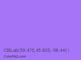 CIELab 59.475,45.825,-58.441 Color is a light violet color and the nearest color is Lavender #b57edc. Hex code #a675f7 and RGB value is rgb(166,117,247). In RGB color space, this color is composed of 65% red, 46% green, 97% blue, In CMYK color space, this color is composed of 33% cyan, 53% magenta, 0% yellow , 3% black , In HSL color space, this color has a hue angle of 263° , 89% saturation and 71% lightness.
