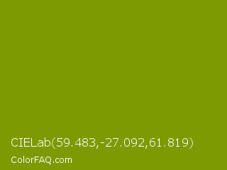 CIELab 59.483,-27.092,61.819 Color is a normal lime color and the nearest color is Limeade #6f9d02. Hex code #7e9a03 and RGB value is rgb(126,154,3). In RGB color space, this color is composed of 49% red, 60% green, 1% blue, In CMYK color space, this color is composed of 18% cyan, 0% magenta, 98% yellow , 40% black , In HSL color space, this color has a hue angle of 71° , 96% saturation and 31% lightness.