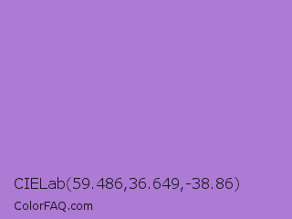 CIELab 59.486,36.649,-38.86 Color is a light purple color and the nearest color is Lavender #b57edc. Hex code #ad7ad4 and RGB value is rgb(173,122,212). In RGB color space, this color is composed of 68% red, 48% green, 83% blue, In CMYK color space, this color is composed of 18% cyan, 42% magenta, 0% yellow , 17% black , In HSL color space, this color has a hue angle of 274° , 51% saturation and 65% lightness.