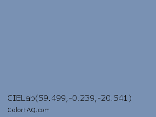 CIELab 59.499,-0.239,-20.541 Color is a normal blue color and the nearest color is Ship Cove #788bba. Hex code #7991b3 and RGB value is rgb(121,145,179). In RGB color space, this color is composed of 47% red, 57% green, 70% blue, In CMYK color space, this color is composed of 32% cyan, 19% magenta, 0% yellow , 30% black , In HSL color space, this color has a hue angle of 215° , 28% saturation and 59% lightness.