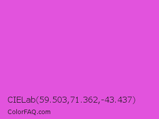 CIELab 59.503,71.362,-43.437 Color is a light magenta color and the nearest color is Purple Pizzazz #fe4eda. Hex code #e253dd and RGB value is rgb(226,83,221). In RGB color space, this color is composed of 89% red, 33% green, 87% blue, In CMYK color space, this color is composed of 0% cyan, 63% magenta, 2% yellow , 11% black , In HSL color space, this color has a hue angle of 302° , 71% saturation and 61% lightness.