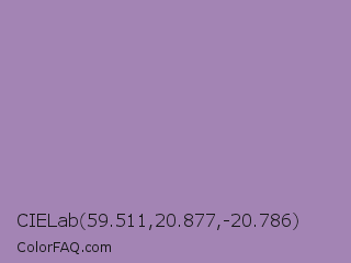 CIELab 59.511,20.877,-20.786 Color is a light purple color and the nearest color is Lavender Purple #967bb6. Hex code #a384b4 and RGB value is rgb(163,132,180). In RGB color space, this color is composed of 64% red, 52% green, 71% blue, In CMYK color space, this color is composed of 9% cyan, 27% magenta, 0% yellow , 29% black , In HSL color space, this color has a hue angle of 279° , 24% saturation and 61% lightness.