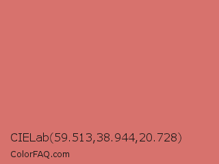 CIELab 59.513,38.944,20.728 Color is a light red color and the nearest color is Japonica #d87c63. Hex code #d7726d and RGB value is rgb(215,114,109). In RGB color space, this color is composed of 84% red, 45% green, 43% blue, In CMYK color space, this color is composed of 0% cyan, 47% magenta, 49% yellow , 16% black , In HSL color space, this color has a hue angle of 3° , 57% saturation and 64% lightness.