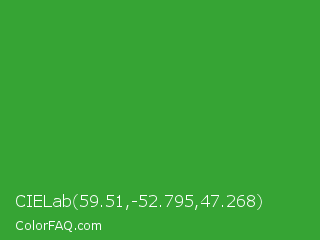 CIELab 59.51,-52.795,47.268 Color is a normal green color and the nearest color is Wageningen Green #34b233. Hex code #36a434 and RGB value is rgb(54,164,52). In RGB color space, this color is composed of 21% red, 64% green, 20% blue, In CMYK color space, this color is composed of 67% cyan, 0% magenta, 68% yellow , 36% black , In HSL color space, this color has a hue angle of 119° , 52% saturation and 42% lightness.
