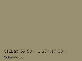 CIELab 59.534,-1.254,17.334 Color is a normal orange color and the nearest color is Pale Oyster #988d77. Hex code #998f71 and RGB value is rgb(153,143,113). In RGB color space, this color is composed of 60% red, 56% green, 44% blue, In CMYK color space, this color is composed of 0% cyan, 7% magenta, 26% yellow , 40% black , In HSL color space, this color has a hue angle of 45° , 16% saturation and 52% lightness.
