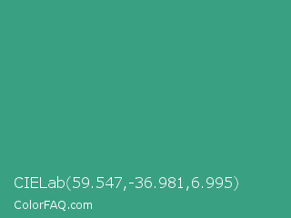 CIELab 59.547,-36.981,6.995 Color is a normal green color and the nearest color is Zomp #39a78e. Hex code #39a082 and RGB value is rgb(57,160,130). In RGB color space, this color is composed of 22% red, 63% green, 51% blue, In CMYK color space, this color is composed of 64% cyan, 0% magenta, 19% yellow , 37% black , In HSL color space, this color has a hue angle of 163° , 47% saturation and 43% lightness.