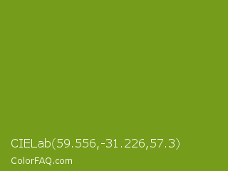 CIELab 59.556,-31.226,57.3 Color is a normal lime color and the nearest color is Olive Drab #6b8e23. Hex code #759c1a and RGB value is rgb(117,156,26). In RGB color space, this color is composed of 46% red, 61% green, 10% blue, In CMYK color space, this color is composed of 25% cyan, 0% magenta, 83% yellow , 39% black , In HSL color space, this color has a hue angle of 78° , 71% saturation and 36% lightness.