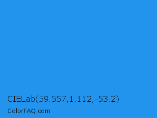 CIELab 59.557,1.112,-53.2 Color is a normal blue color and the nearest color is Button Blue #24a0ed. Hex code #2294ed and RGB value is rgb(34,148,237). In RGB color space, this color is composed of 13% red, 58% green, 93% blue, In CMYK color space, this color is composed of 86% cyan, 38% magenta, 0% yellow , 7% black , In HSL color space, this color has a hue angle of 206° , 85% saturation and 53% lightness.