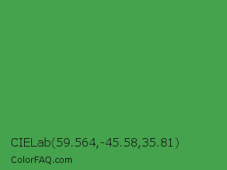 CIELab 59.564,-45.58,35.81 Color is a normal green color and the nearest color is Fruit Salad #4f9d5d. Hex code #45a24d and RGB value is rgb(69,162,77). In RGB color space, this color is composed of 27% red, 64% green, 30% blue, In CMYK color space, this color is composed of 57% cyan, 0% magenta, 52% yellow , 36% black , In HSL color space, this color has a hue angle of 125° , 40% saturation and 45% lightness.