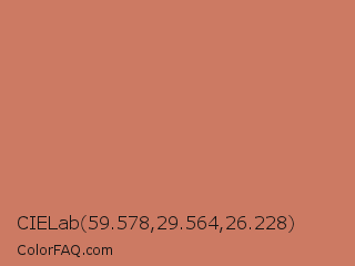 CIELab 59.578,29.564,26.228 Color is a normal red color and the nearest color is Japonica #d87c63. Hex code #cc7a63 and RGB value is rgb(204,122,99). In RGB color space, this color is composed of 80% red, 48% green, 39% blue, In CMYK color space, this color is composed of 0% cyan, 40% magenta, 51% yellow , 20% black , In HSL color space, this color has a hue angle of 13° , 51% saturation and 59% lightness.