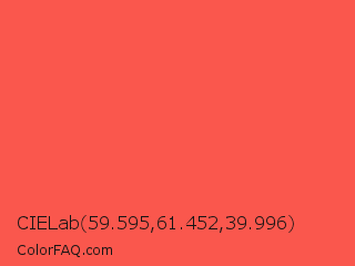 CIELab 59.595,61.452,39.996 Color is a light red color and the nearest color is Red Orange #ff5349. Hex code #fa574d and RGB value is rgb(250,87,77). In RGB color space, this color is composed of 98% red, 34% green, 30% blue, In CMYK color space, this color is composed of 0% cyan, 65% magenta, 69% yellow , 2% black , In HSL color space, this color has a hue angle of 3° , 95% saturation and 64% lightness.
