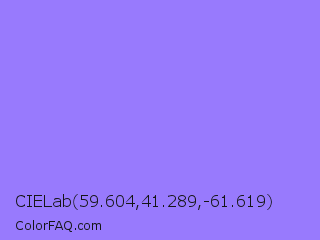 CIELab 59.604,41.289,-61.619 Color is a light indigo color and the nearest color is Medium Purple #9370db. Hex code #987afd and RGB value is rgb(152,122,253). In RGB color space, this color is composed of 60% red, 48% green, 99% blue, In CMYK color space, this color is composed of 40% cyan, 52% magenta, 0% yellow , 1% black , In HSL color space, this color has a hue angle of 254° , 97% saturation and 74% lightness.