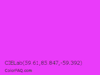 CIELab 59.61,85.847,-59.392 Color is a light magenta color and the nearest color is Purple Pizzazz #fe4eda. Hex code #eb3bfa and RGB value is rgb(235,59,250). In RGB color space, this color is composed of 92% red, 23% green, 98% blue, In CMYK color space, this color is composed of 6% cyan, 76% magenta, 0% yellow , 2% black , In HSL color space, this color has a hue angle of 295° , 95% saturation and 61% lightness.
