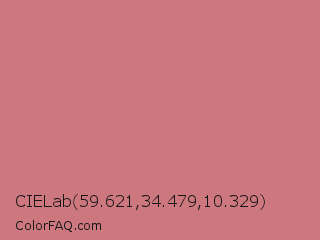 CIELab 59.621,34.479,10.329 Color is a light red color and the nearest color is New York Pink #d7837f. Hex code #cd777f and RGB value is rgb(205,119,127). In RGB color space, this color is composed of 80% red, 47% green, 50% blue, In CMYK color space, this color is composed of 0% cyan, 42% magenta, 38% yellow , 20% black , In HSL color space, this color has a hue angle of 354° , 46% saturation and 64% lightness.