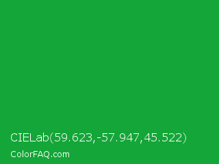 CIELab 59.623,-57.947,45.522 Color is a normal green color and the nearest color is Green Pantone #00ad43. Hex code #14a638 and RGB value is rgb(20,166,56). In RGB color space, this color is composed of 8% red, 65% green, 22% blue, In CMYK color space, this color is composed of 88% cyan, 0% magenta, 66% yellow , 35% black , In HSL color space, this color has a hue angle of 135° , 78% saturation and 36% lightness.