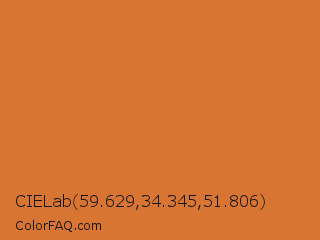 CIELab 59.629,34.345,51.806 Color is a normal orange color and the nearest color is Bronze #cd7f32. Hex code #d97533 and RGB value is rgb(217,117,51). In RGB color space, this color is composed of 85% red, 46% green, 20% blue, In CMYK color space, this color is composed of 0% cyan, 46% magenta, 76% yellow , 15% black , In HSL color space, this color has a hue angle of 24° , 69% saturation and 53% lightness.