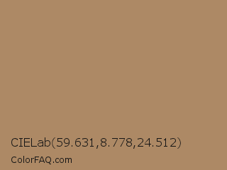 CIELab 59.631,8.778,24.512 Color is a normal orange color and the nearest color is Light Taupe #b38b6d. Hex code #ad8965 and RGB value is rgb(173,137,101). In RGB color space, this color is composed of 68% red, 54% green, 40% blue, In CMYK color space, this color is composed of 0% cyan, 21% magenta, 42% yellow , 32% black , In HSL color space, this color has a hue angle of 30° , 31% saturation and 54% lightness.