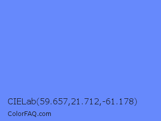 CIELab 59.657,21.712,-61.178 Color is a light blue color and the nearest color is Cornflower Blue #6495ed. Hex code #6689fc and RGB value is rgb(102,137,252). In RGB color space, this color is composed of 40% red, 54% green, 99% blue, In CMYK color space, this color is composed of 60% cyan, 46% magenta, 0% yellow , 1% black , In HSL color space, this color has a hue angle of 226° , 96% saturation and 69% lightness.