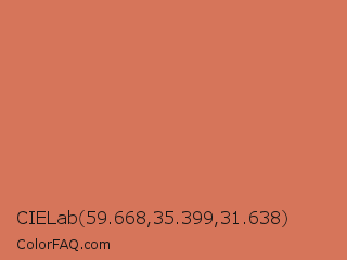 CIELab 59.668,35.399,31.638 Color is a normal red color and the nearest color is Japonica #d87c63. Hex code #d6755a and RGB value is rgb(214,117,90). In RGB color space, this color is composed of 84% red, 46% green, 35% blue, In CMYK color space, this color is composed of 0% cyan, 45% magenta, 58% yellow , 16% black , In HSL color space, this color has a hue angle of 13° , 60% saturation and 60% lightness.