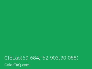 CIELab 59.684,-52.903,30.088 Color is a normal green color and the nearest color is Green Pigment #00a550. Hex code #15a558 and RGB value is rgb(21,165,88). In RGB color space, this color is composed of 8% red, 65% green, 35% blue, In CMYK color space, this color is composed of 87% cyan, 0% magenta, 47% yellow , 35% black , In HSL color space, this color has a hue angle of 148° , 77% saturation and 36% lightness.