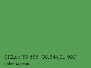 CIELab 59.686,-38.844,31.999 Color is a normal green color and the nearest color is Fruit Salad #4f9d5d. Hex code #56a055 and RGB value is rgb(86,160,85). In RGB color space, this color is composed of 34% red, 63% green, 33% blue, In CMYK color space, this color is composed of 46% cyan, 0% magenta, 47% yellow , 37% black , In HSL color space, this color has a hue angle of 119° , 31% saturation and 48% lightness.