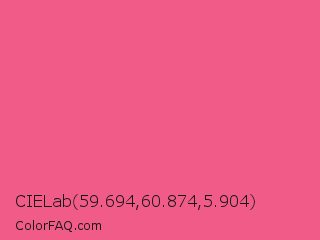 CIELab 59.694,60.874,5.904 Color is a light rose color and the nearest color is Strawberry #fc5a8d. Hex code #f05b88 and RGB value is rgb(240,91,136). In RGB color space, this color is composed of 94% red, 36% green, 53% blue, In CMYK color space, this color is composed of 0% cyan, 62% magenta, 43% yellow , 6% black , In HSL color space, this color has a hue angle of 342° , 83% saturation and 65% lightness.