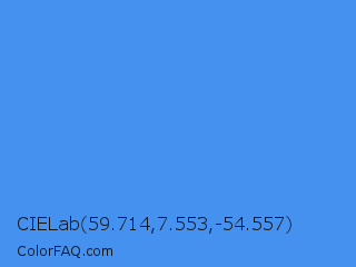 CIELab 59.714,7.553,-54.557 Color is a light blue color and the nearest color is Blueberry #4f86f7. Hex code #4591f0 and RGB value is rgb(69,145,240). In RGB color space, this color is composed of 27% red, 57% green, 94% blue, In CMYK color space, this color is composed of 71% cyan, 40% magenta, 0% yellow , 6% black , In HSL color space, this color has a hue angle of 213° , 85% saturation and 61% lightness.