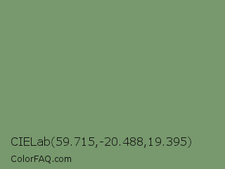 CIELab 59.715,-20.488,19.395 Color is a normal green color and the nearest color is Laurel #749378. Hex code #77996d and RGB value is rgb(119,153,109). In RGB color space, this color is composed of 47% red, 60% green, 43% blue, In CMYK color space, this color is composed of 22% cyan, 0% magenta, 29% yellow , 40% black , In HSL color space, this color has a hue angle of 106° , 18% saturation and 51% lightness.