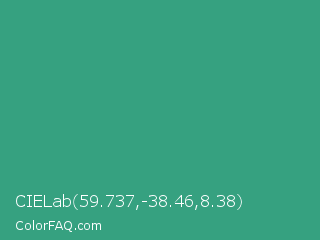 CIELab 59.737,-38.46,8.38 Color is a normal green color and the nearest color is Zomp #39a78e. Hex code #36a180 and RGB value is rgb(54,161,128). In RGB color space, this color is composed of 21% red, 63% green, 50% blue, In CMYK color space, this color is composed of 66% cyan, 0% magenta, 20% yellow , 37% black , In HSL color space, this color has a hue angle of 161° , 50% saturation and 42% lightness.