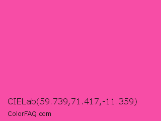 CIELab 59.739,71.417,-11.359 Color is a light rose color and the nearest color is Brilliant Rose #f653a6. Hex code #f74da6 and RGB value is rgb(247,77,166). In RGB color space, this color is composed of 97% red, 30% green, 65% blue, In CMYK color space, this color is composed of 0% cyan, 69% magenta, 33% yellow , 3% black , In HSL color space, this color has a hue angle of 329° , 91% saturation and 64% lightness.