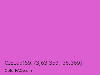 CIELab 59.73,63.353,-36.369 Color is a light magenta color and the nearest color is Orchid #da70d6. Hex code #dc5ed1 and RGB value is rgb(220,94,209). In RGB color space, this color is composed of 86% red, 37% green, 82% blue, In CMYK color space, this color is composed of 0% cyan, 57% magenta, 5% yellow , 14% black , In HSL color space, this color has a hue angle of 305° , 64% saturation and 62% lightness.