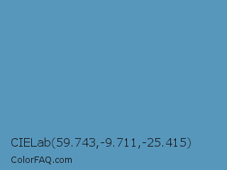 CIELab 59.743,-9.711,-25.415 Color is a normal blue color and the nearest color is Hippie Blue #589aaf. Hex code #5897bc and RGB value is rgb(88,151,188). In RGB color space, this color is composed of 35% red, 59% green, 74% blue, In CMYK color space, this color is composed of 53% cyan, 20% magenta, 0% yellow , 26% black , In HSL color space, this color has a hue angle of 202° , 43% saturation and 54% lightness.