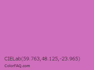 CIELab 59.763,48.125,-23.965 Color is a light magenta color and the nearest color is Sky Magenta #cf71af. Hex code #ce6ebb and RGB value is rgb(206,110,187). In RGB color space, this color is composed of 81% red, 43% green, 73% blue, In CMYK color space, this color is composed of 0% cyan, 47% magenta, 9% yellow , 19% black , In HSL color space, this color has a hue angle of 312° , 49% saturation and 62% lightness.