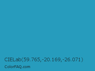 CIELab 59.765,-20.169,-26.071 Color is a normal cyan color and the nearest color is Eastern Blue #1e9ab0. Hex code #269cbd and RGB value is rgb(38,156,189). In RGB color space, this color is composed of 15% red, 61% green, 74% blue, In CMYK color space, this color is composed of 80% cyan, 17% magenta, 0% yellow , 26% black , In HSL color space, this color has a hue angle of 193° , 67% saturation and 45% lightness.