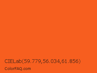 CIELab 59.779,56.034,61.856 Color is a normal orange color and the nearest color is Giants Orange #fe5a1d. Hex code #f75e1f and RGB value is rgb(247,94,31). In RGB color space, this color is composed of 97% red, 37% green, 12% blue, In CMYK color space, this color is composed of 0% cyan, 62% magenta, 87% yellow , 3% black , In HSL color space, this color has a hue angle of 18° , 93% saturation and 55% lightness.