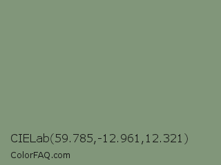 CIELab 59.785,-12.961,12.321 Color is a normal green color and the nearest color is Battleship Gray #828f72. Hex code #81967a and RGB value is rgb(129,150,122). In RGB color space, this color is composed of 51% red, 59% green, 48% blue, In CMYK color space, this color is composed of 14% cyan, 0% magenta, 19% yellow , 41% black , In HSL color space, this color has a hue angle of 105° , 12% saturation and 53% lightness.